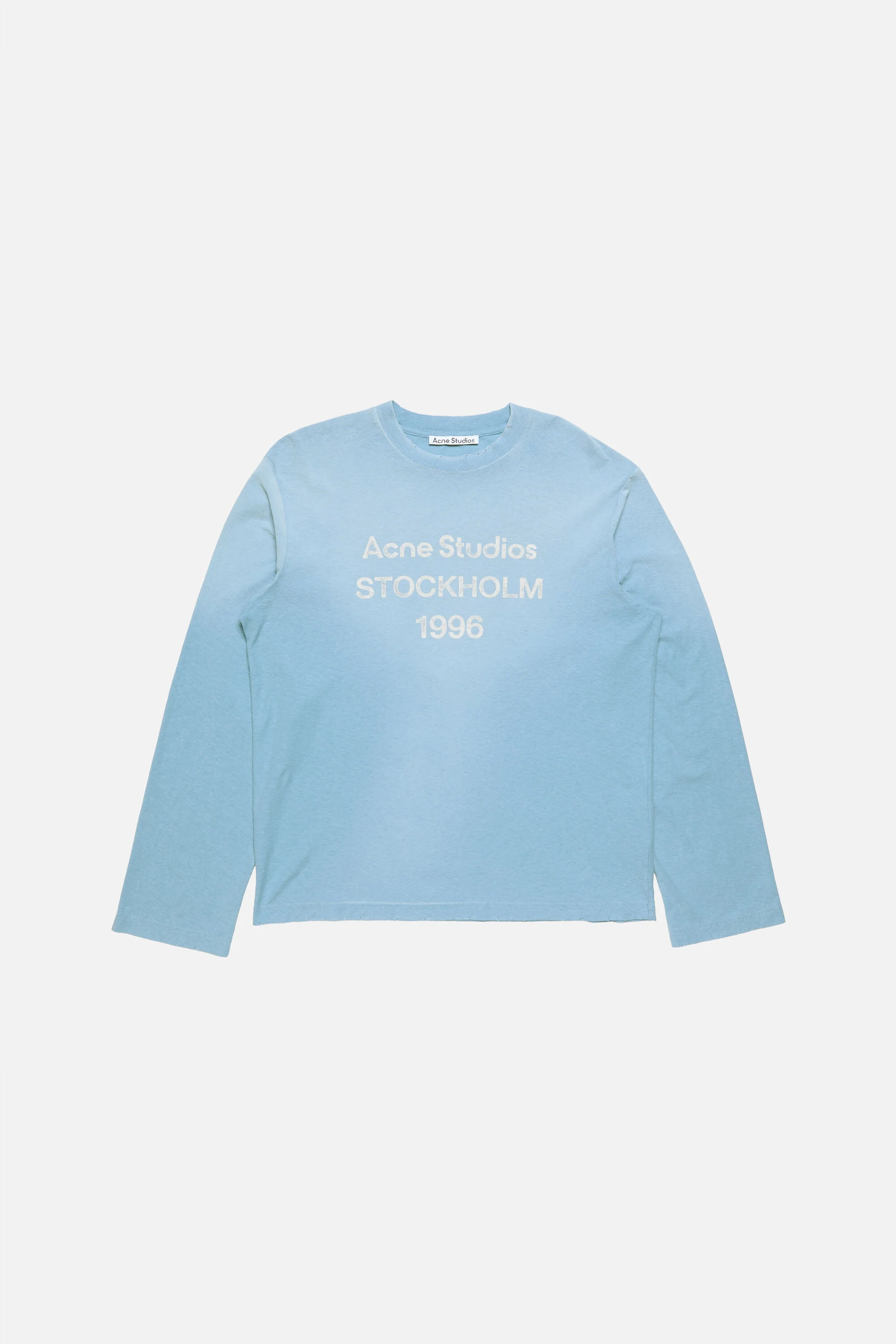 Long-sleeve crewneck T-shirt crafted from organic cotton jersey with an irregular surface, sprayed for a vintage-inspired look. Detailed with an Acne Studios 1996 stamp logo and finished with distressed trim. Cut to a relaxed unisex fit with a hip-length silhouette. - Crewneck T-shirt - Sprayed cotton jersey - Relaxed unisex fit - Hip length - Long sleeves - Distressed trim - Acne Studios 1996 stamp logo - Female model is 177 cm / 5'10 and wears a S - Style ID: FN-UX-TSHI000016 - Made with organically grown cotton - Shell: 85% Cotton, 15% True hemp