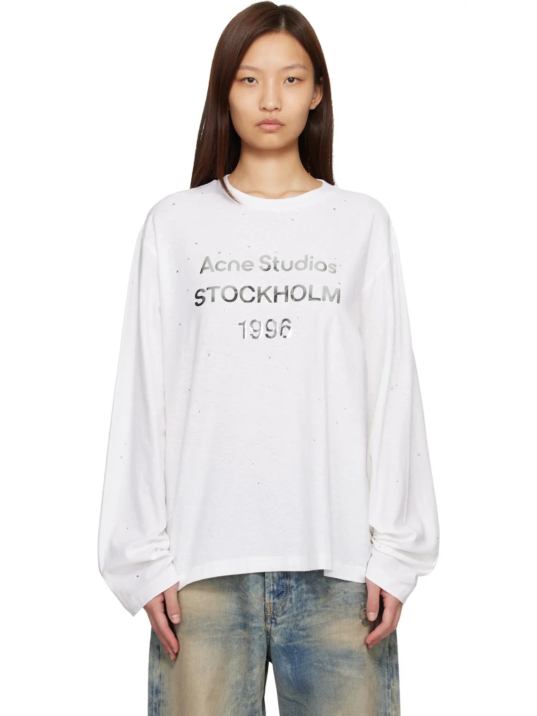 Cotton- and hemp-blend jersey T-shirt. · Rhinestones throughout · Rib-knit crewneck · Logo printed at front · Dropped shoulders Supplier color: Optic white 85% cotton, 15% hemp. Made in Portugal 261129F110003