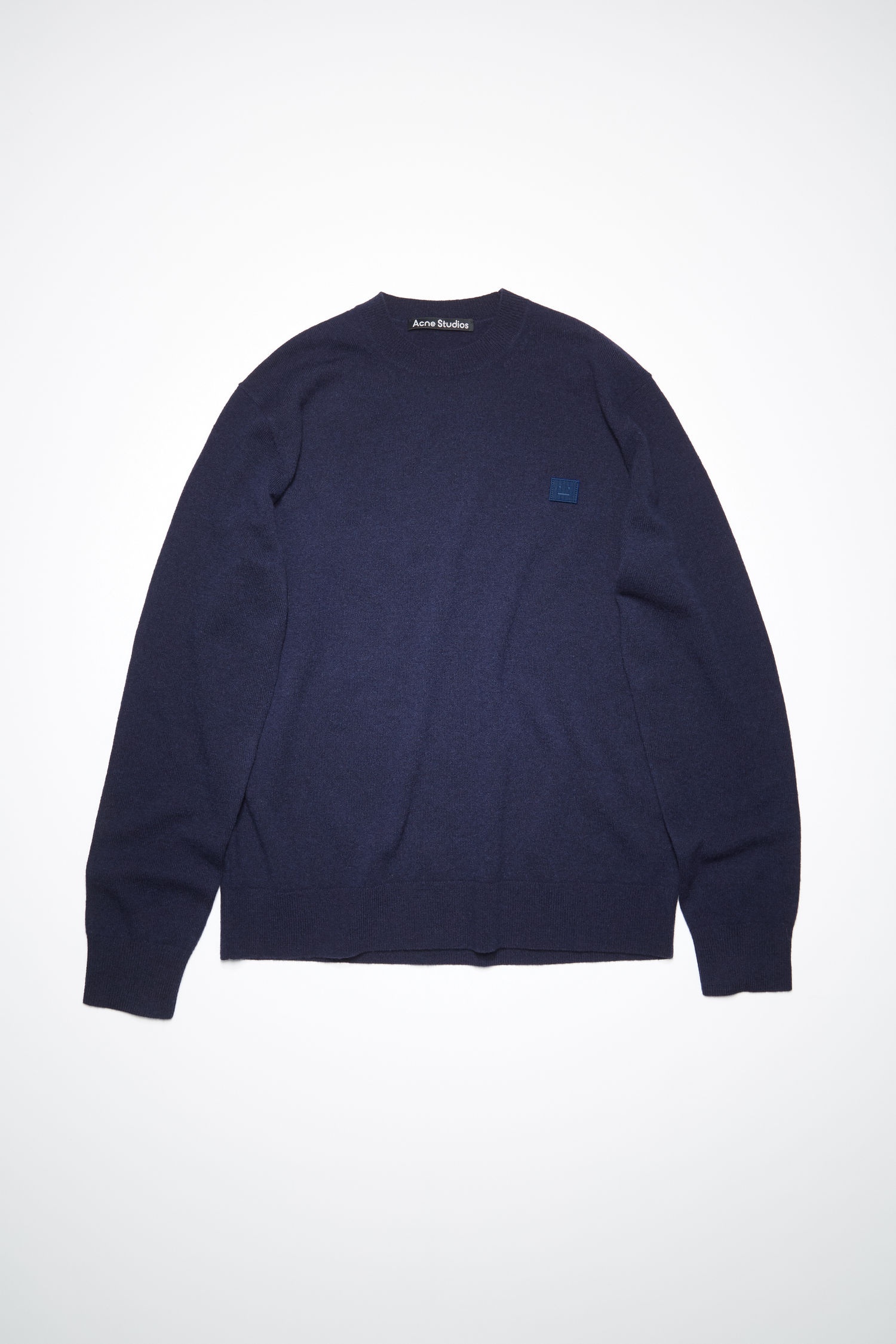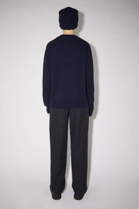 Acne Studios navy crew neck sweater features a tonal embroidered face patch and regular fit that is true to size. Details: - Regular fit - Crew neck - Tonal embroidered face patch - Style ID: FA-UX-KNIT000033 - Made with certified wool according to the Responsible Wool Standard - Main material: 100% wool Sizing: - True to size, take your usual size - Fitted across the shoulders, falls loose through the body - European sizing - Female model is 178cm/5'8" and wears a size XS - Male model is 185cm/6'1" and wears a size M
