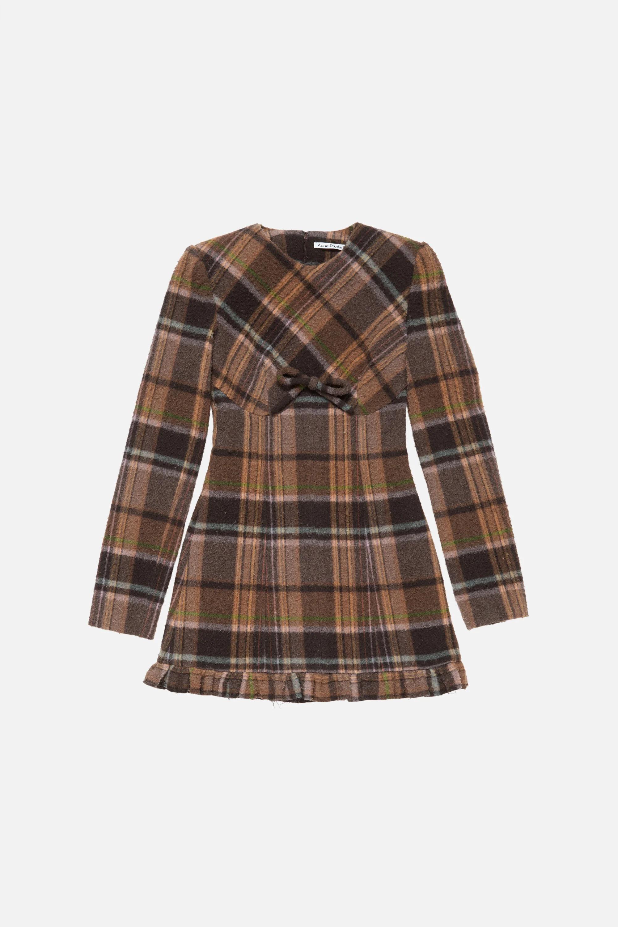 Mini dress crafted from a midweight textured wool blend in a check pattern. A reimagined take on the babydoll dress, it’s shaped with darts for a soft hourglass silhouette. Finished with a bow detail at the chest and a ruffled skirt hem. Cut to a fitted style and mid-thigh length. - Mini dress - Fitted style - Mid-thigh length - Bow detail on chest - Ruffles on hem - Invisible zip closure - Model is 180 cm / 5'9 and wears a size 36 - Style ID: FN-WN-DRES001481 - Made in Italy - Shell: 70% Wool, 25% Nylon, 5% Other fibres, Lining: 33% Polyester, 67% Acetate