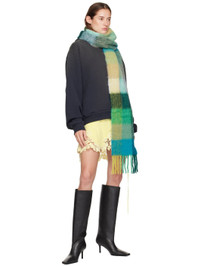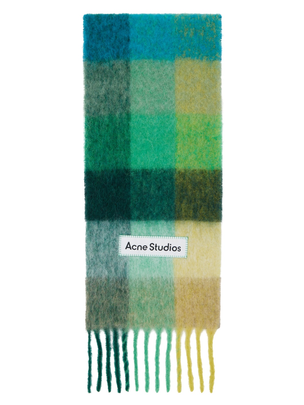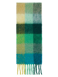 Rectangular brushed alpaca- and wool-blend flannel scarf in tones of green and blue. · Check pattern throughout · Logo patch at face · Fringed detailing at ends · L98" x W11" Supplier color: Jade green/Yellow