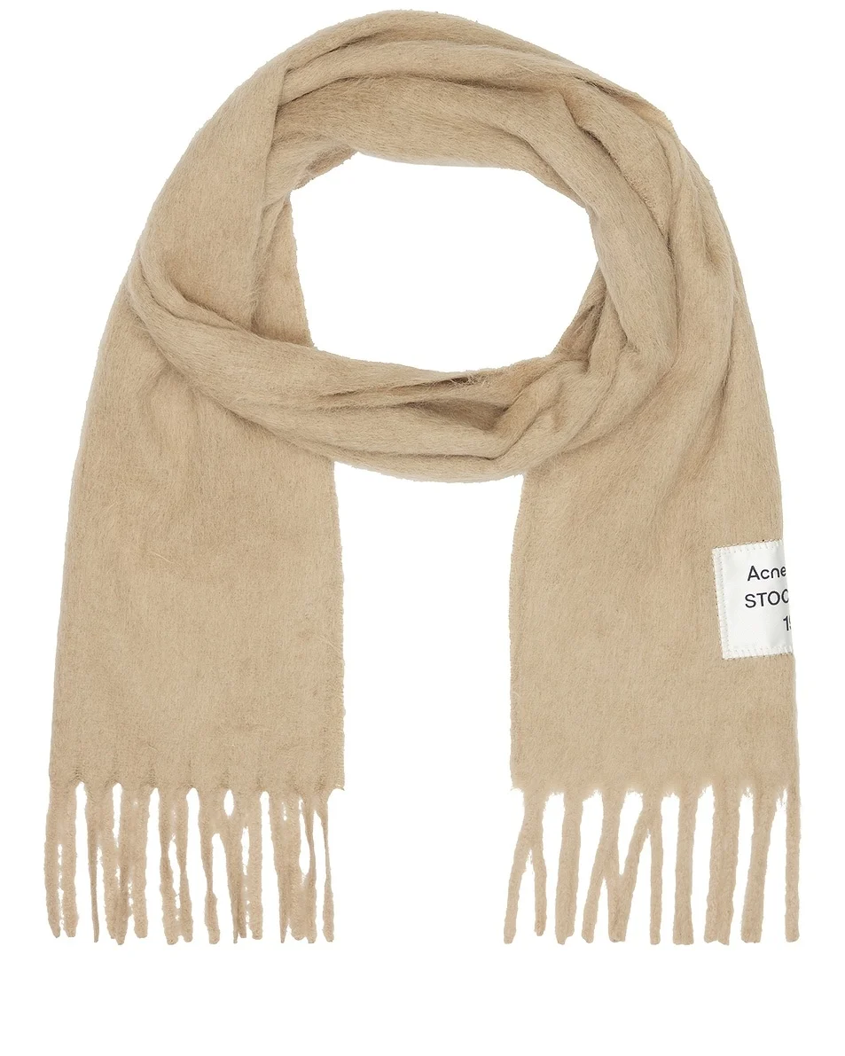 Details - 80% alpaca, 20% nylon - Made in Italy - Dry clean - Fuzzy knit fabric with Acne Studios logo patch and fringed trim - Measures approx 205 cm W x 30 cm H - Our Style No. ACNE-WA223 - Manufacturer Style No. CA0350