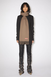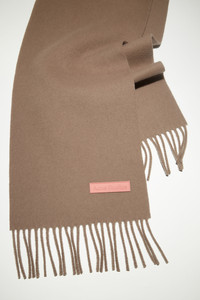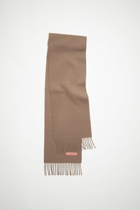 Acne Studios warm beige fringe scarf is crafted from rich wool, detailed with an Acne Studios logo pink label patch. - Rich compact wool - Acne Studios pink logo patch - Measurement including fringe: 25 cm x 200 cm - Fringe measurements: 7cm approx. - Style ID: FN-UX-SCAR000287 - Made with certified wool according to the Responsible Wool Standard. - Shell: 100% Wool