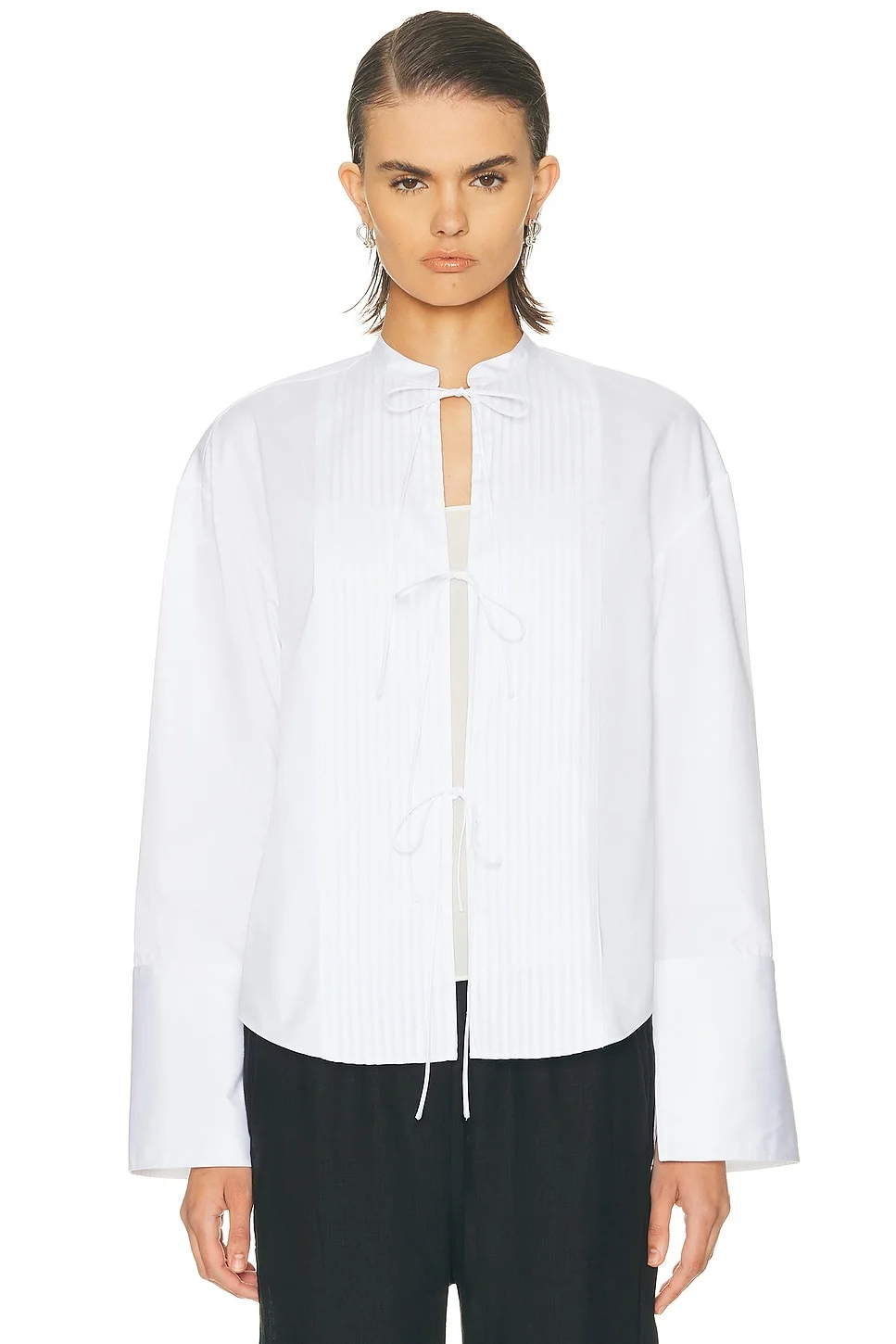 Details - Self 1: 100% organic cotton - Self 2: 100% cotton - Dry clean only - Front tie-up closure with open design - Optional camisole included - Slits at cuffs - Poplin fabric - Made in US - Our Style No. ALIP-WS35 - Manufacturer Style No. P25145CS