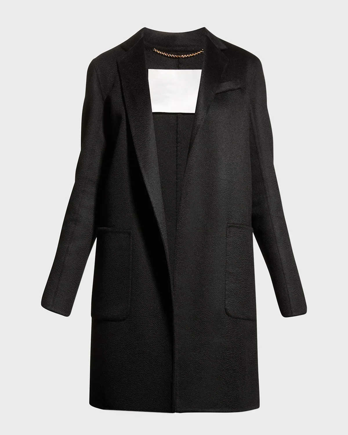 Adam Lippes car coat in zibeline cashmere Notch lapels; open front Long sleeves Chest welt pocket; side patch pockets Straight fit Hem falls below the knee Centerback vented hem Cashmere Made in USA