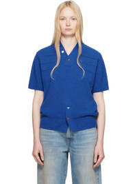 Boucle-knit cotton-blend sweater. · V-neck · Three-button placket · Perforations and pinched seams at front and back · Button vent at front hem · Rib-knit hem and cuffs · Frayed flag with topstitching at back · Mismatched hardware Supplier color: Blue 57% cotton, 21% acrylic, 13% nylon, 9% polyester. Made in Viet Nam 251039F100000