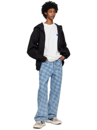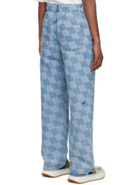 13.5 oz non-stretch denim jeans. Fading and laser-printed logo pattern throughout. · Belt loops · Four-pocket styling · Zip-fly · Logo flag at back leg · Logo-engraved silver-tone hardware · Contrast stitching in tan Supplier color: Blue