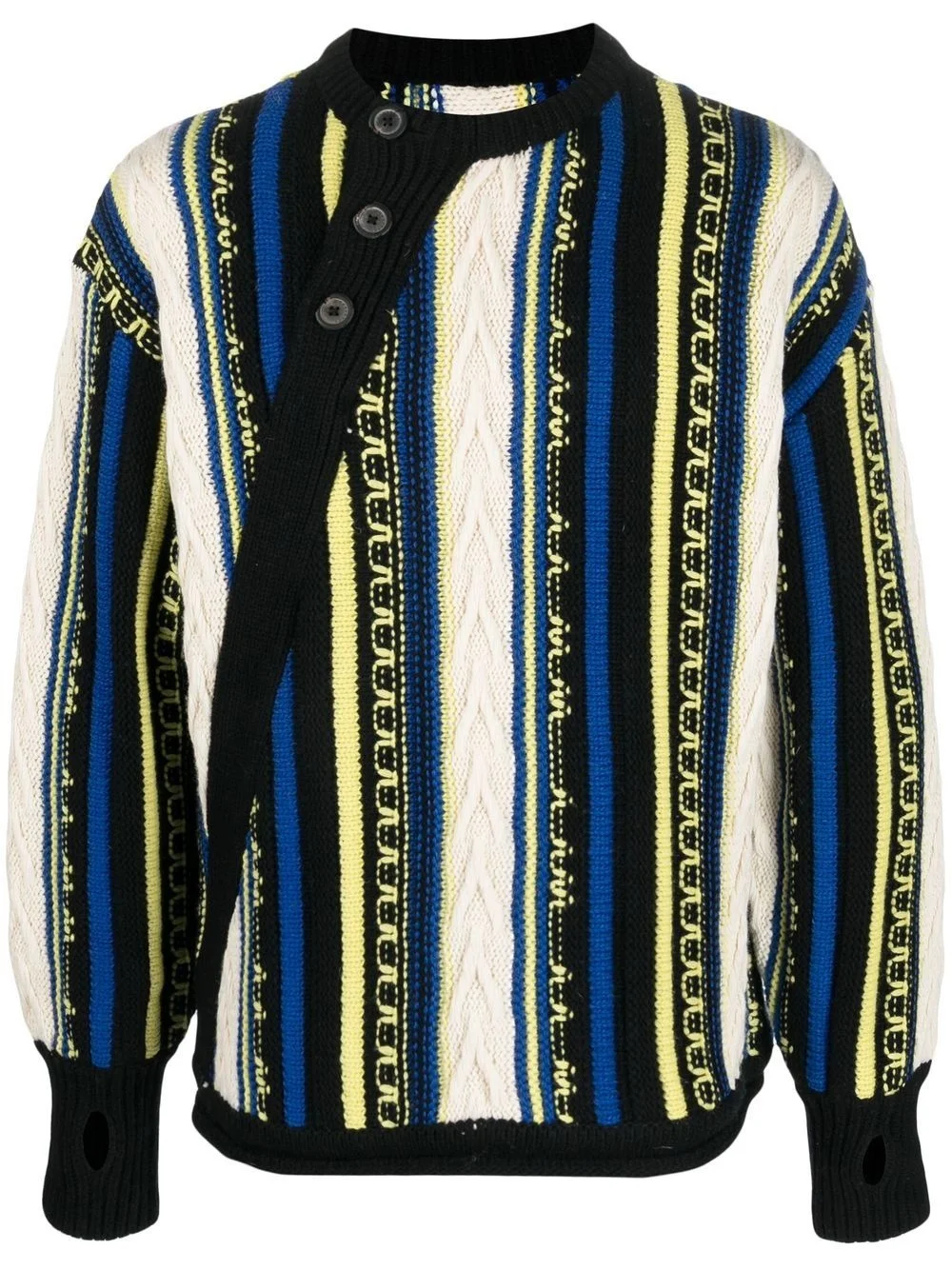 Frema striped-knit buttoned jumper black/multicolour wool blend knitted construction ribbed-knit edge vertical stripe pattern logo-debossed buttons crew neck off-centre front button fastening drop shoulder long sleeves straight hem When buying this unisex item, keep in mind that it is graded in standard men's sizing. Imported Composition Wool 80%, Acrylic 20% SIZE & FIT Model measurements Height 5 ft 11 in(1.8 m) Bust/Chest 31.49 in(80 cm) Hips 36.41 in(92.5 cm) Waist 25.59 in(65 cm) FittingInformation This piece is unisex. Please take care when selecting your size Designed for a loose fit for men and an oversized fit for women Made with a mid-weight fabric Washing instructions Dry Clean Only
