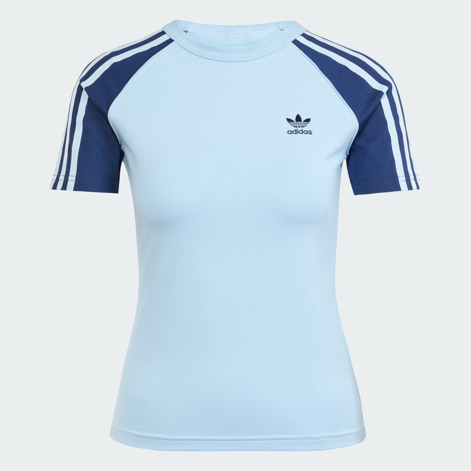 A slim-fit tee with classic sport style. This adidas tee updates an everyday essential with a slim fit that hugs the body and a little bit of stretch for extra comfort. The contrast-color raglan sleeves and Trefoil give it retro appeal while 3-Stripes on the shoulders root it in sport heritage. Details - Slim fit - Crewneck - 93% cotton, 7% elastane - Imported - Product code: JD0836 - Product color: Clear Sky