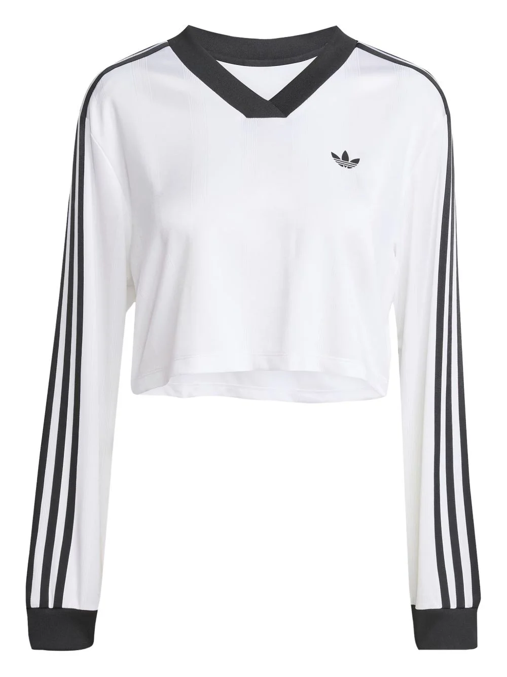 three-stripe V-neck top Highlights - White - V-neck - Long sleeves - Cropped - Three stripes logo Imported Composition Recycled Polyester 100% Washing instructions Read Manufacturer Guidelines