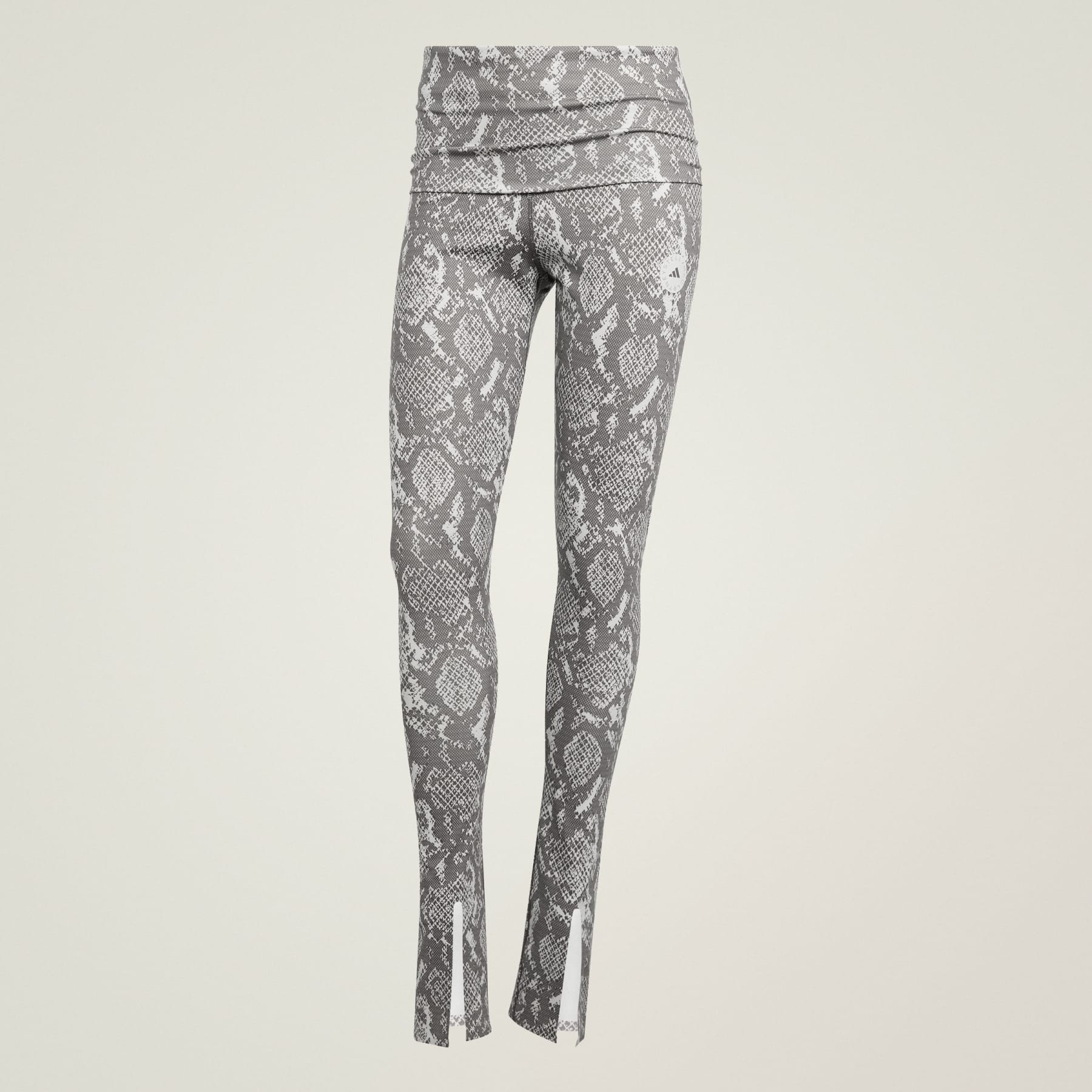 Sweat-wicking tights with a high-rise, roll-top waist. Feel strong, look stylish and train without distraction in these adidas by Stella McCartney leggings. An allover python print brings a fierce energy, easily channeled into your workout. The moisture-absorbing fabric keeps you comfortably dry as you power through your workout, while the soft, stretchy material feels smooth against your skin. The leggings feature a flattering high-waisted roll-top for extra support and coverage, and have split cuffs that complement your trainers. The tight fit hugs your body, giving you the freedom to move through any exercise. Details - Tight fit - Elastic waist - 79% polyester (recycled), 21% elastane (recycled) - Imported - Product code: JM8477 - Product color: Almond Milk-Smc / Charcoal