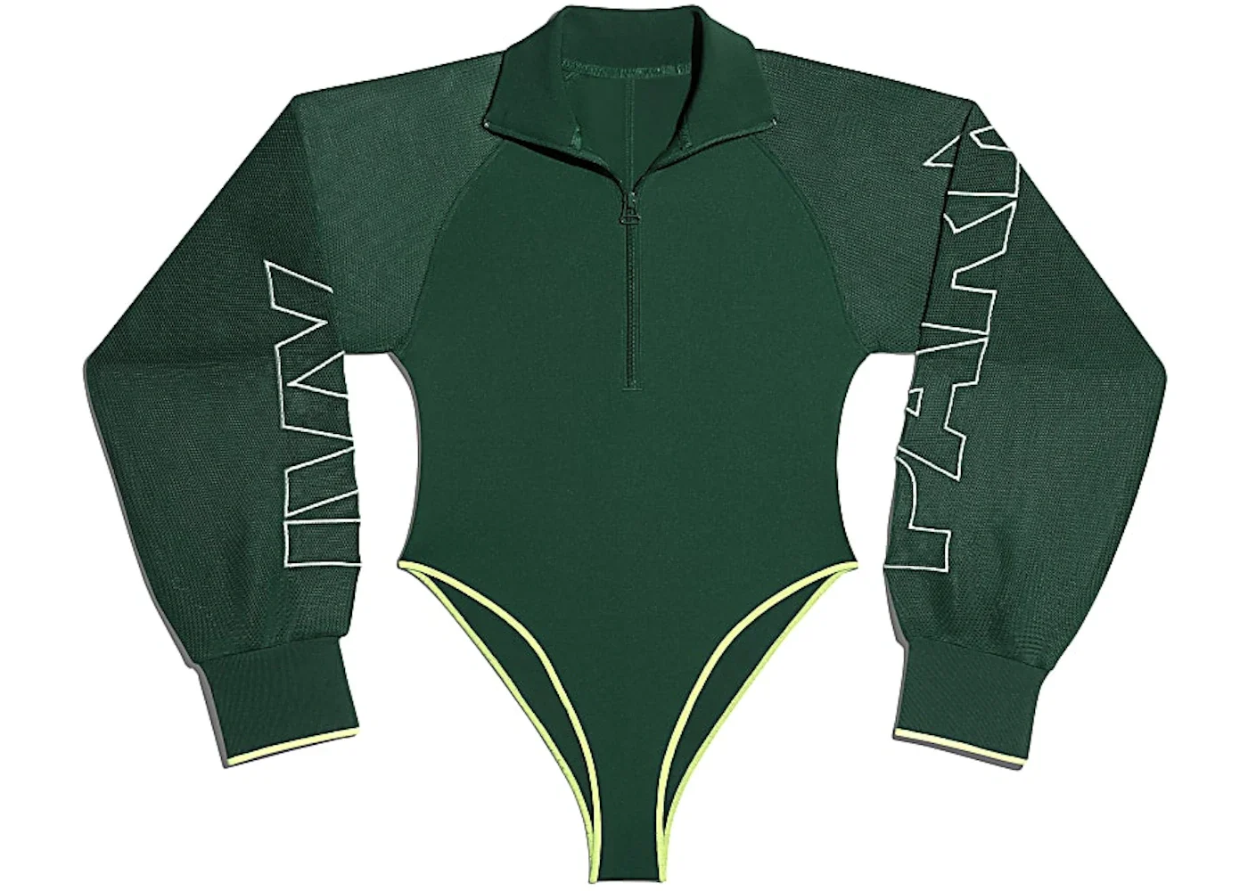IVY PARK and adidas released this Dark Green Mesh Sleeve Bodysuit in late October, 2020, as a part of their second collaborative delivery of the year. The bodysuit was released in both traditional sizing as well as plus sizing and features somewhat translucent mesh sleeves with IVY PARK branding across the shoulders and adidas branding on the sleeve. The is made from a polyester, cotton, and elastane blend with a half-zip high collar. This IVY PARK x adidas Bodysuit dropped on October 29th, 2020 at a retail price of $80 USD. - Season FW20 - Color Dark Green/Hi-Res Yellow - Release Date 2020-10-29 - Retail Price 80 - Featured false