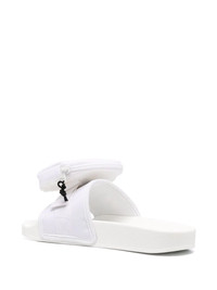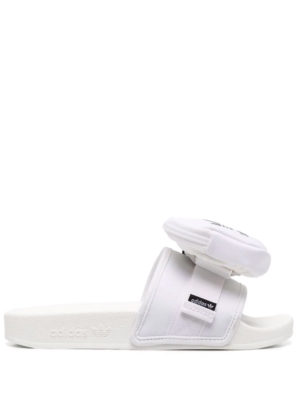 Adilette logo-strap slides Highlights - White - Signature 3-stripes logo - Front zip-fastening pouch pocket - Flat rubber sole - Slip-on style - Flat rubber sole Imported Composition Outer: Leather 100%
