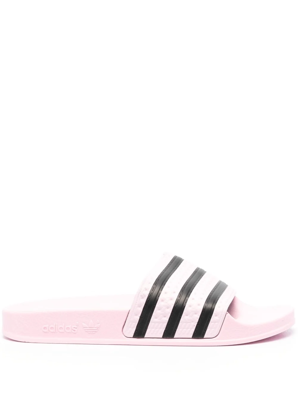 Adilette slip-on slides Highlights - Light pink/black - Open toe - Signature 3-stripes logo - Logo at the sole - Almond toe - Slip-on style - Moulded footbed - Flat rubber sole Made in Italy Composition Outer: PVC 100% Lining: PVC 100% Sole: Rubber 100% SIZE & FIT Measurement HEEL 0.78 in(2 cm)