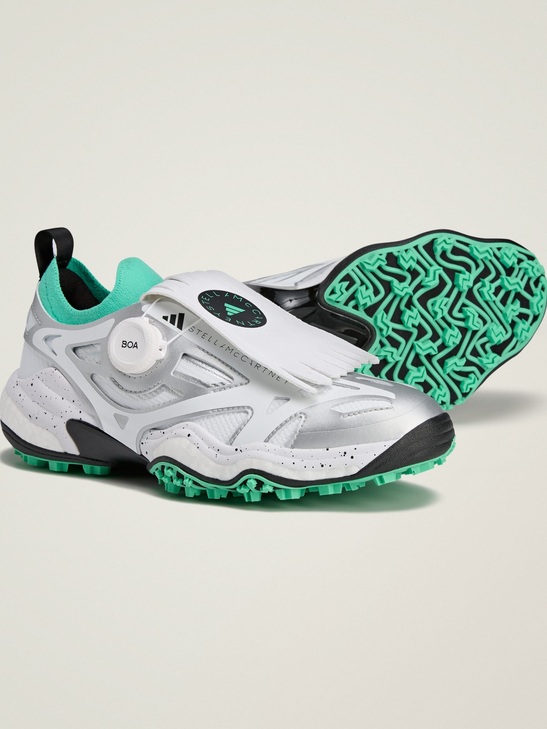 High-traction golf shoes made in part with recycled materials. Your golf game and your style game just got supercharged with these adidas by Stella McCartney Codechaos BOA Shoes. If the shape looks familiar, that's because it is. The inspiration comes from one of adidas' highest performance running trainers, though it rides on the innovative tooling of the Codechaos golf shoes. In the midsole, BOOST and Lightstrike cushioning work together to energize your steps and stance with an ultra-responsive feel underfoot. The BOA® Fit System lets you make precise, on-the-fly adjustments to your fit. Play with the silhouette by keeping or removing the detachable tongue, done with a magnetic closure. This product features at least 20% recycled materials. By reusing materials that have already been created, we help to reduce waste and our reliance on finite resources and reduce the footprint of the products we make. Details - Regular fit - Micro-adjustable dial-based BOA® Fit System - Synthetic and textile upper - BOOST and Lightstrike cushioning - Textile lining - Weight: 361 g (size UK 5.5) - Midsole drop: 8 mm (heel: 23 mm / forefoot: 15 mm) - Traxion outsole - Imported - Product code: JH8937 - Product color: Core White / Bright Green / Silver Metallic