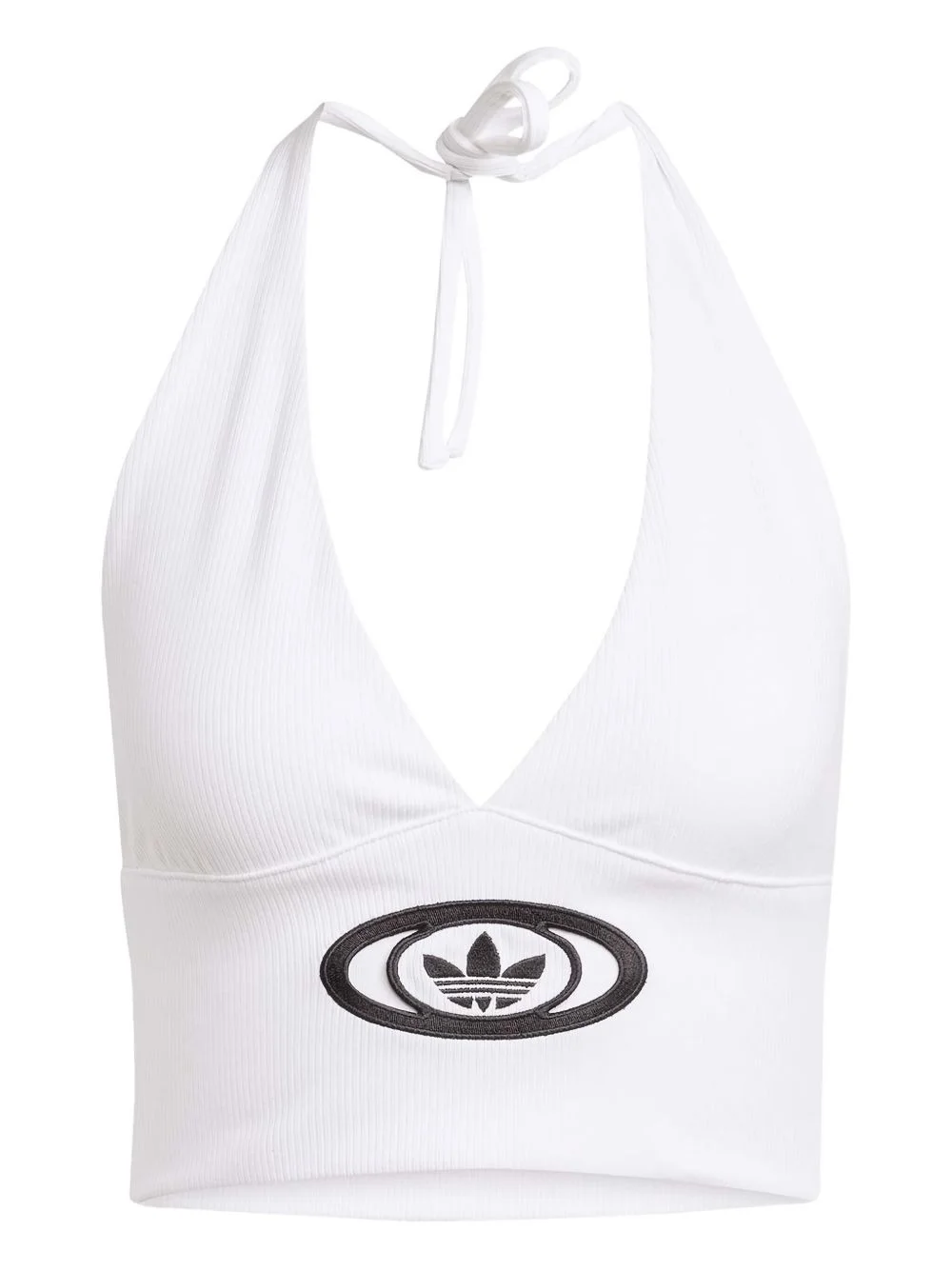 halterneck ribbed tank top Highlights - White - Ribbed fabric - Halterneck - Tie fastening - Oval logo emblem Imported Composition Viscose 47%, Cotton 43%, Elastane 10% Washing instructions Read Manufacturer Guidelines