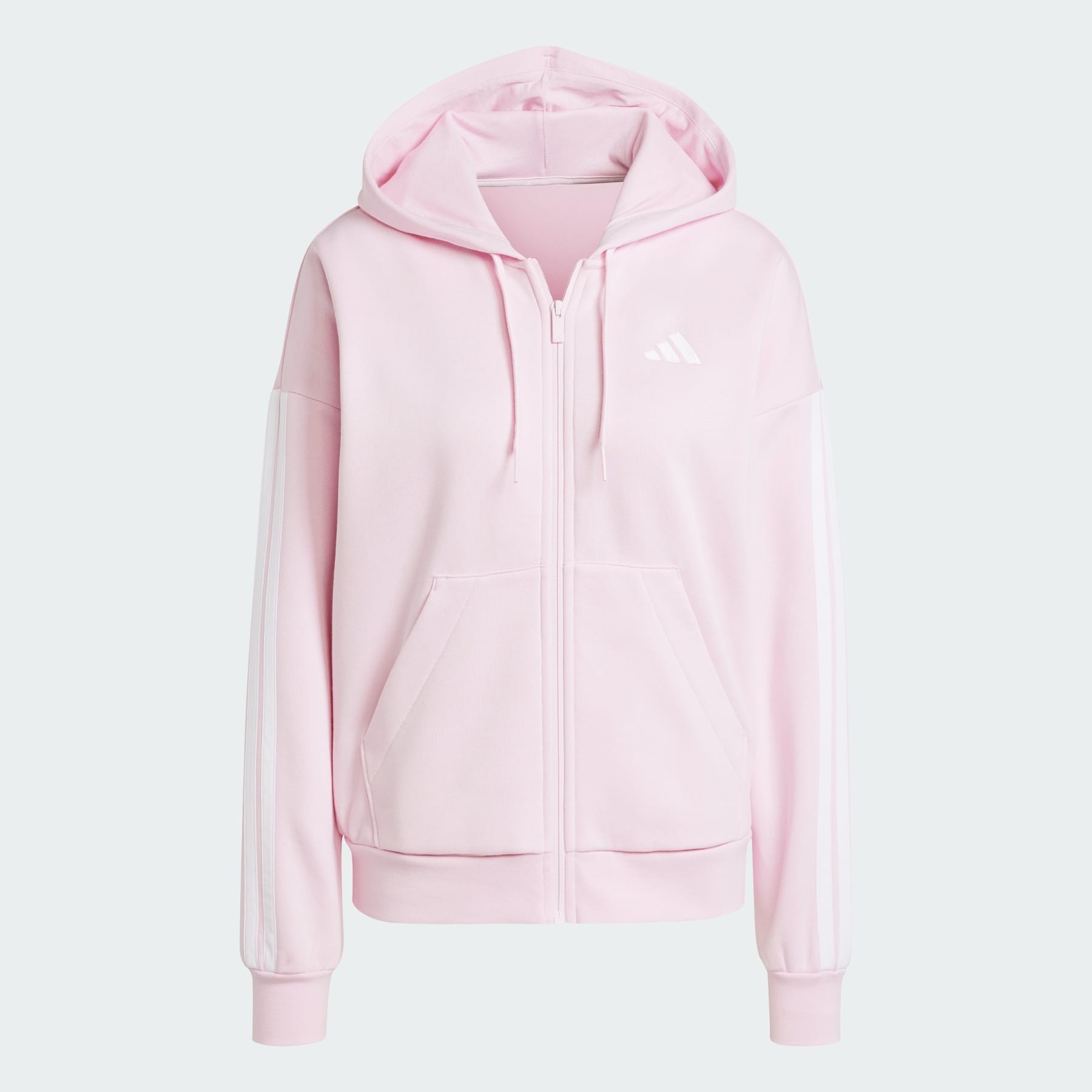 A comfy hoodie made in part with a blend of recycled and renewable materials. Wherever the day takes you, this adidas hoodie has you covered. The soft brushed-back fleece build feels Cozy and warm, and the classic 3-Stripes down the sleeves keep your athletic spirit on display. A 3 Bar Logo on the chest adds an extra sporty touch. The full-zip front and drawcord-adjustable hood let you customize your coverage. By choosing recycled, we are able to reuse materials that have already been created, which helps to reduce waste. Renewable materials choices will help us to remove our reliance on finite resources. Our products made with a blend of recycled and renewable materials feature at least 70% total of these materials. Details - Regular fit - Full zip with drawcord-adjustable hood - 55% cotton, 36% polyester (recycled), 9% viscose - Kangaroo pockets - Cuffed sleeves - Contains a minimum of 70% recycled and renewable content - Imported - Product code: JE1286 - Product color: Clear Pink / White