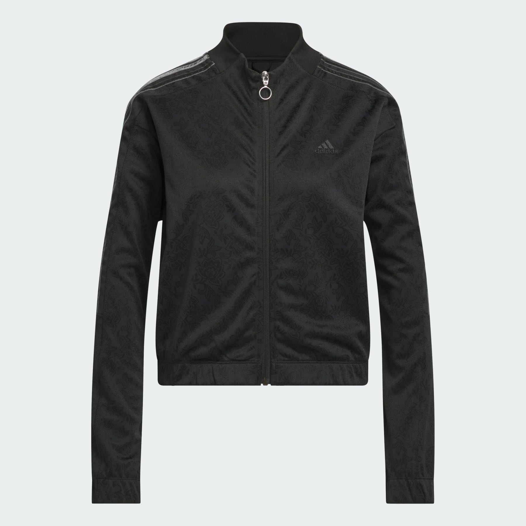 A loose-fit jacket with metallic details. This adidas jacket is all about elevated everyday style. It's made from jacquard fabric with a lacy look. The loose fit makes it perfect for layering. Metallic accents add a touch of shine. Details - Loose fit - Full zip with low collar - 100% polyester (recycled) - Front zip pockets - Elastic cuffs - Allover print - Imported - Product code: JI5619 - Product color: Black