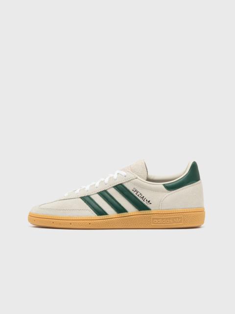 The adidas Handball Spezial was developed in the 70s for fast moves in handball. This version comes with a suede and synthetic upper and a natural rubber outsole. - Laces - Synthetic lining - Natural rubber outsole Article number: JS0242 Gender: men,women Color: ALUMIN/CGREEN/GUM1 Material: Upper material: 100% Synthetic/Textile