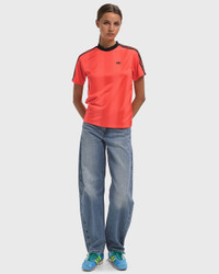 The adidas Adicolor Football Jacquard Tee features a unique jacquard texture that adds a subtle soccer vibe to the classic 3-stripes sleeves. The loose regular fit with ribbed crew neck ensures comfort and casual chic, while the subtle Trefoil logo on the chest underlines the label's typical charm. - Ribbed collar - Relaxed fit - Short sleeves This item is partly made of certified, recycled and sustainable materials, reducing the global amount of waste and conserving primary raw materials. Discover a wide range of sustainable items now at BSTN! Article Number: JV9646 Gender: Women Color: LUCRED/BLACK Material: 100% Polyester