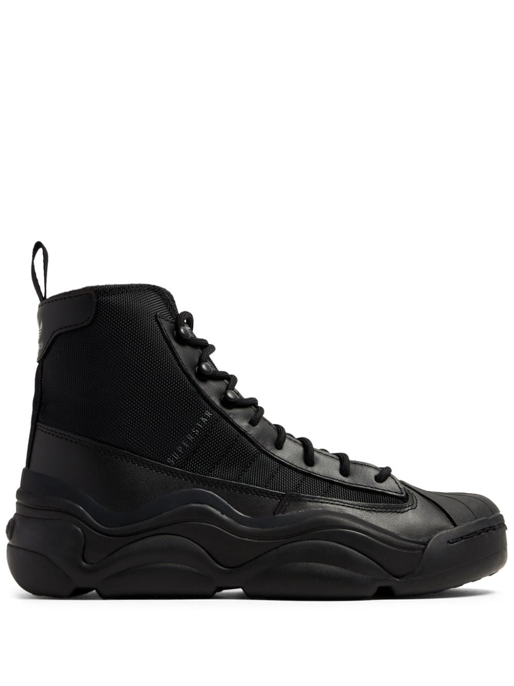 lace-up ankle boots Highlights - Black - Panelled design - Ankle-length - Signature trefoil logo detail - Branded heel counter - Pull-tab at the heel - Front lace-up fastening - Rubber toecap - Round toe - Chunky rubber sole Imported Composition Outer: Fabric 100% Lining: Fabric 100% Sole: Rubber 100%