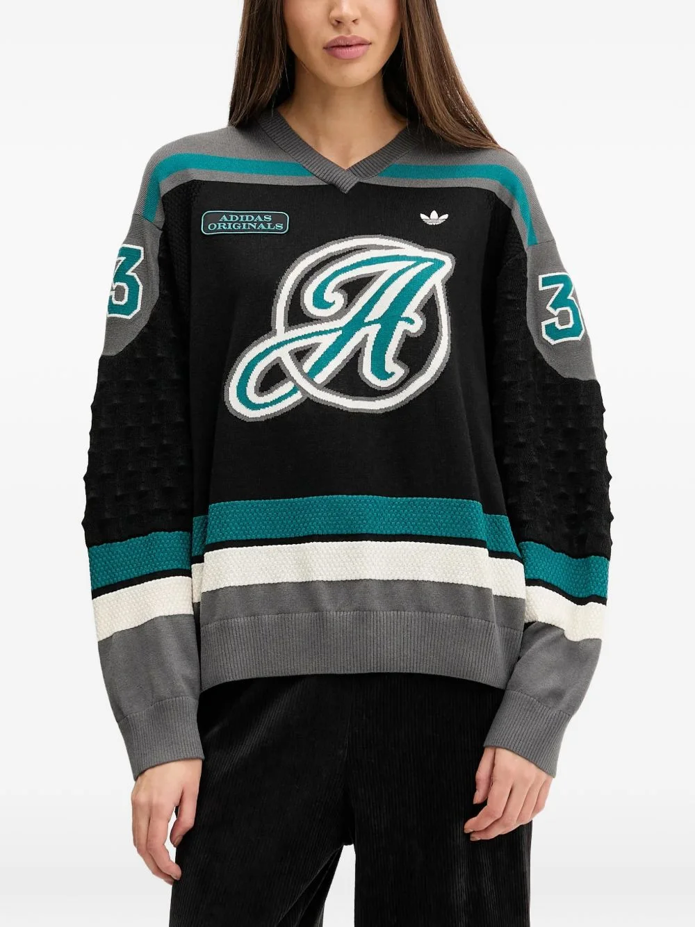 letter V-neck knitwear Highlights - Black - Letter detail - V-neck - Number detail - Long sleeved - Ribbed trim Imported Composition Polyester 80%, Wool 20% Washing instructions Read Manufacturer Guidelines