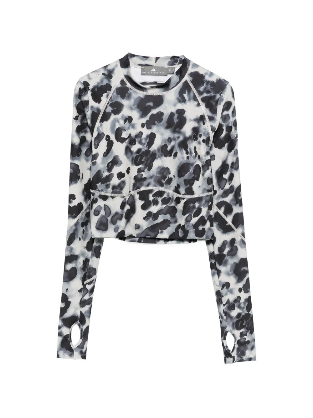 animal-pattern compression top Highlights - Grey - Animal pattern - Long sleeves - Thumb holes - Cropped - Round neck Imported Composition Recycled Polyester 79%, Spandex/Elastane 21% Washing instructions Machine Wash