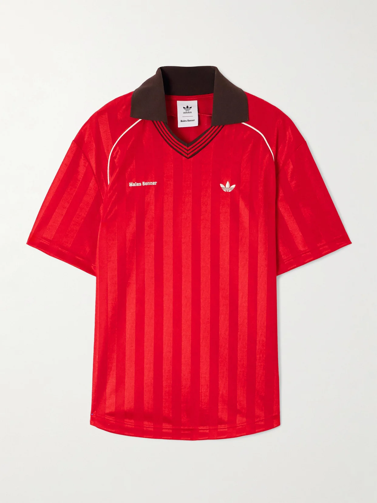 adidas Originals and Wales Bonner's retro-inspired, sporty pieces are a perfect blend of both brands' heritage and aesthetics. Modeled on vintage football jerseys, this T-shirt is made from recycled fibers with tonal stripes and a contrasting collar. The embroidered logos are placed on the chest, in lieu of a team emblem.