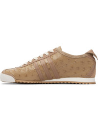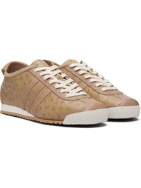 Low-top ostrich-embossed and buffed leather sneakers. · Lace-up closure · Suede trim at collar · Signature serrated stripes at sides and heel · Logo stamp at outer side · Foldover heel tab · Suede lining · Treaded rubber sole Supplier color: Cardboard/Brown Desert/Cream White Upper: leather. Sole: rubber. Made in Italy 252751F128116