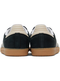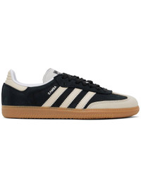 Low-top nubuck sneakers in black and beige. · Grained and buffed leather trim throughout · Lace-up closure · Logo printed at tongue · Padded collar · Signature serrated stripes at sides · Text embossed at outer side · Grained leather and mesh lining · Treaded rubber sole Supplier color: Core black/Wonder white/Silver metallic Upper: leather. Sole: rubber. Made in Viet Nam 251751F128217