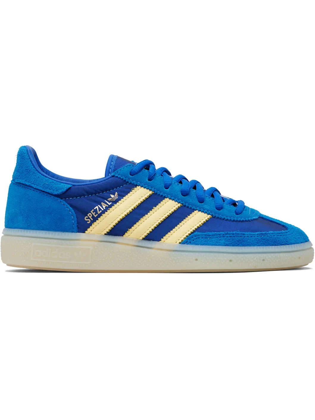 Low-top suede and taffeta sneakers. · Lace-up closure · Logo patch at tongue · Padded collar · Signature serrated stripes at sides · Text and logo stamp at outer side · Mesh lining · Rubberized logo patch at crepe rubber midsole · Treaded rubber sole Supplier color: Equipment blue/Almost yellow/Off white Upper: textile, leather. Sole: rubber. Made in Viet Nam 261751F128136