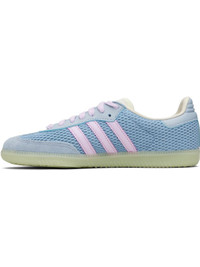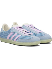 Low-top perforated leather, suede, and buffed leather sneakers. · Lace-up closure · Logo embossed at tongue · Padded collar · Signature serrated stripes at sides · Quilted heel tab · Leather and mesh lining · Treaded rubber sole Supplier color: Tactile blue/Ice lavender/Off white Upper: leather. Sole: rubber. Made in Viet Nam 251751F128052