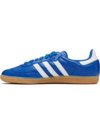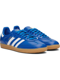 Low-top buffed leather sneakers. · Lace-up closure · Logo embossed at tongue · Padded collar · Signature serrated stripes at sides · Text stamp at outer side · Quilted heel tab · Faux-leather lining · Treaded rubber sole Supplier color: Blue/White/Gum Upper: leather. Sole: rubber. Made in Viet Nam 252751F128135