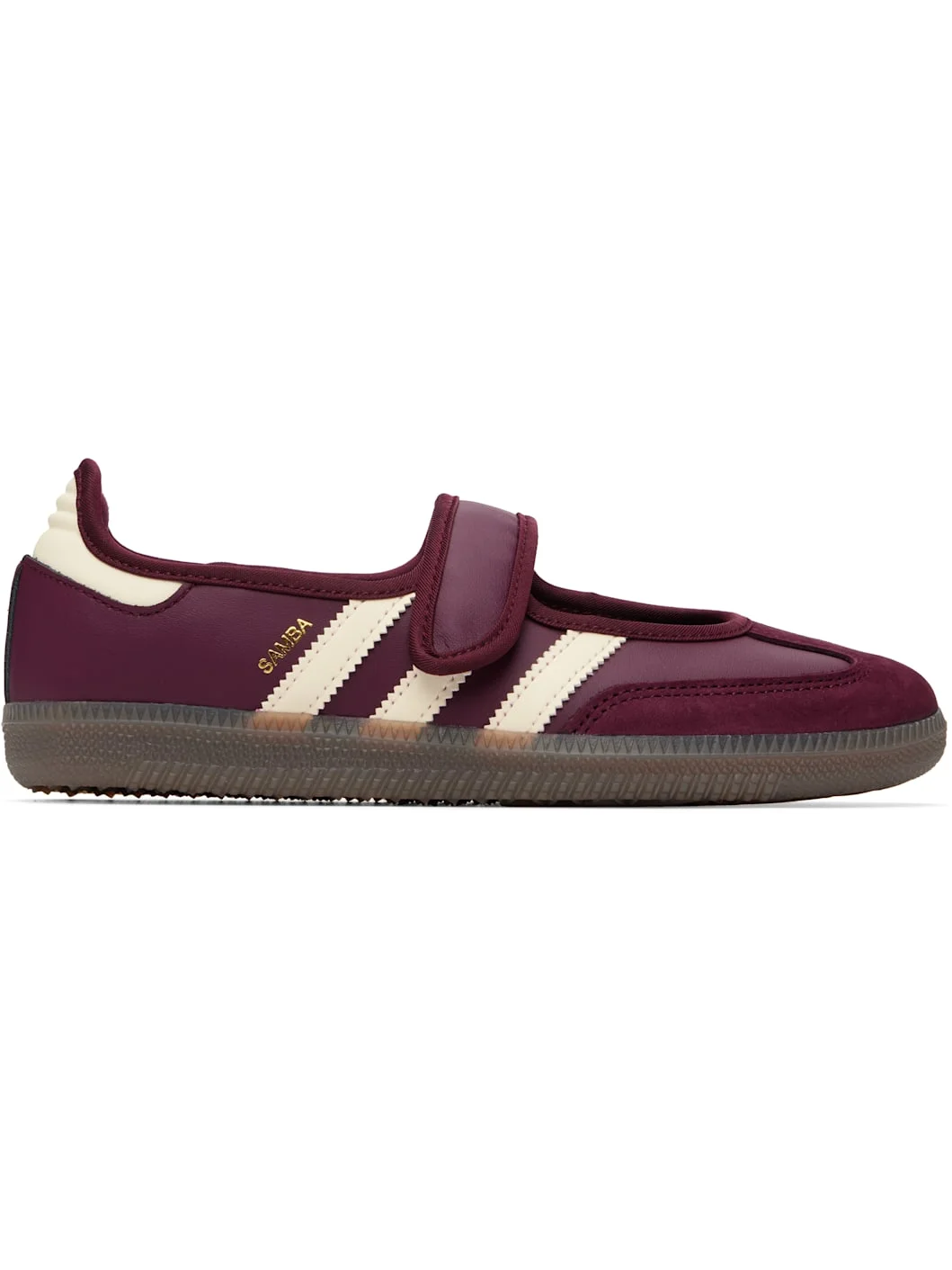Low-top buffed leather Mary Jane-style sneakers. · Suede trim at toe · Velcro strap at vamp · Padded collar · Logo stamp at outer side · Signature serrated stripes at sides · Quilted heel tab · Treaded rubber sole Supplier color: Maroon/Cream White/Gold Metallic Upper: leather. Sole: rubber. Made in Viet Nam 261751F128067