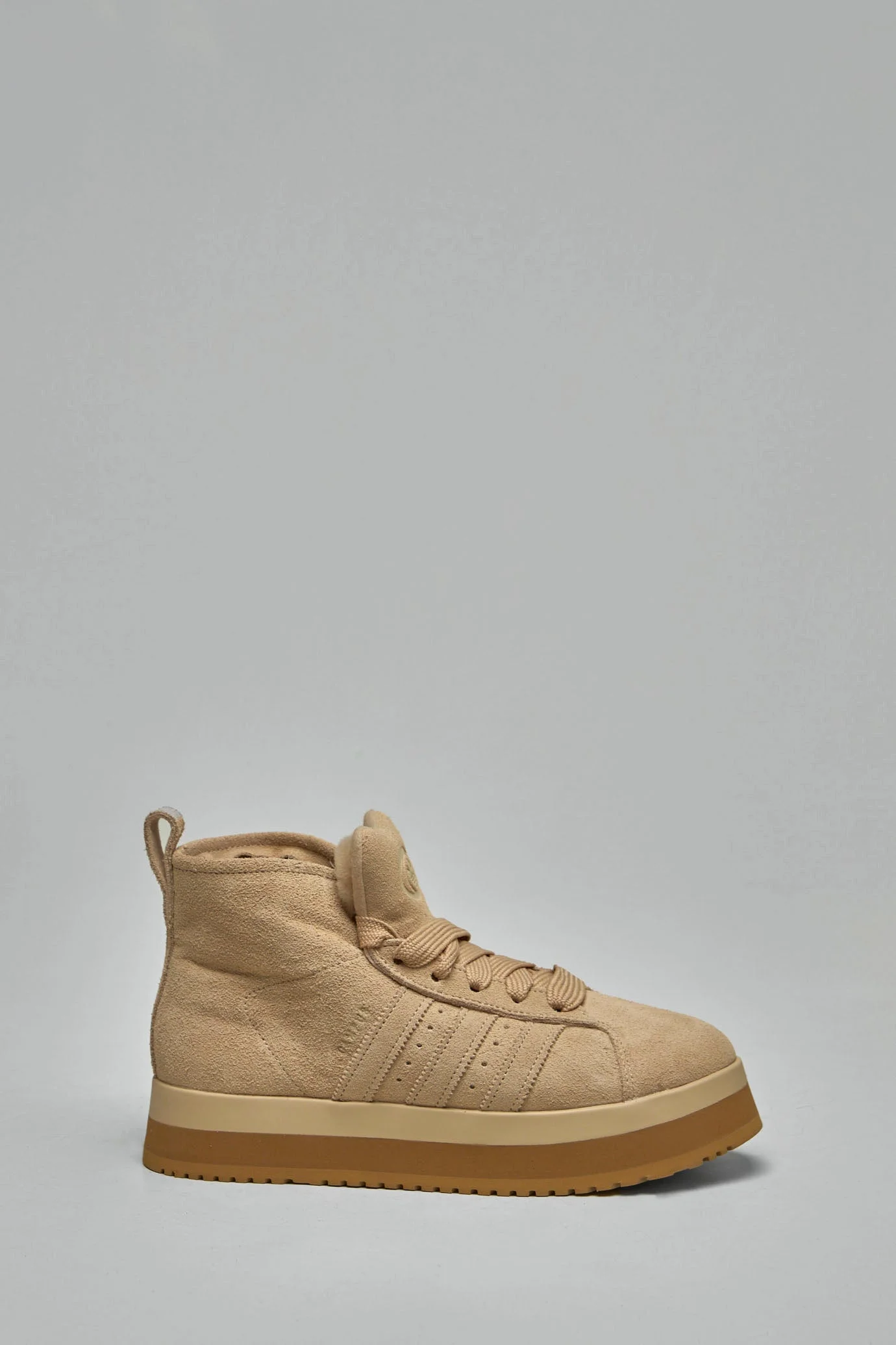High top sneakers in beige suede with a chunky two-tone platform sole. It has flat laces, stitched three-stripe side detailing with perforations, and a heel pull tab for easy on. Materials: Suede upper; Sheepskin lining; Rubber outsole Color: magbei/magbei/gum4 SKU: 153599 Brand style: JR3735