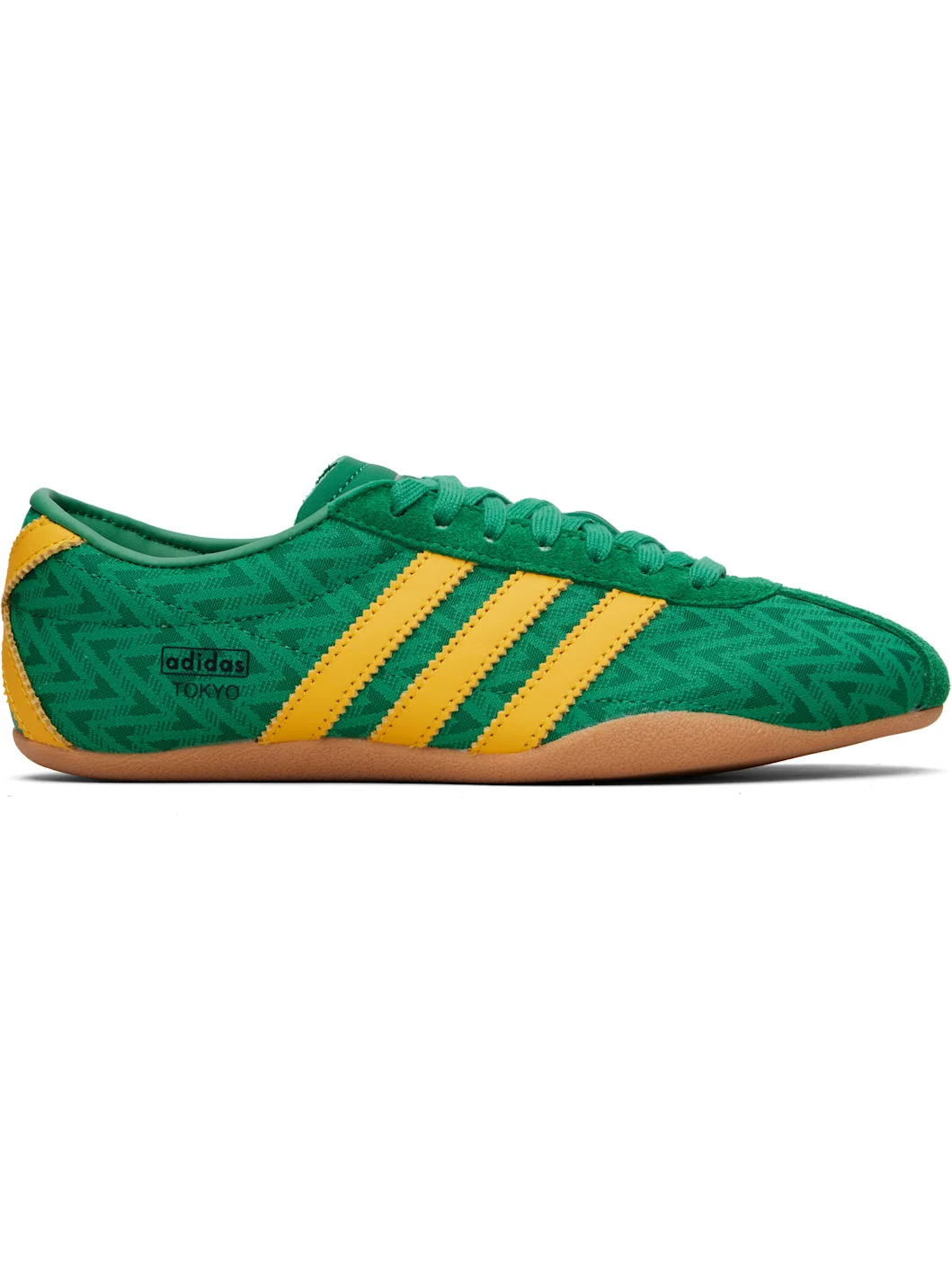 Low-top knit, suede, and buffed leather sneakers. · Jacquard graphic pattern throughout · Lace-up closure · Logo stamp embossed at tongue · Padded collar · Signature serrated stripes at sides and heel · Logo and text bonded at outer side · Buffed faux-leather lining · Crepe rubber sole Supplier color: Bold Green/Eqt Yellow/Core Black Upper: textile, leather. Sole: rubber. Made in Viet Nam 261751F128159