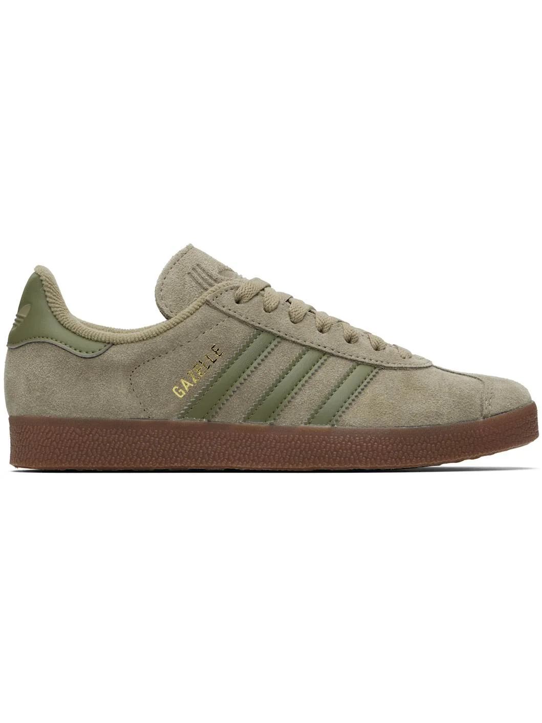 Low-top suede sneakers. · Lace-up closure · Logo stamp at tongue · Padded collar · Signature serrated stripes at sides · Text printed at outer side · Logo embossed at heel tab · Terrycloth lining · Treaded rubber sole Supplier color: Orbit Green/Focus Olive/Gold Metallic Upper: leather. Sole: rubber. Made in Viet Nam 252751F128132