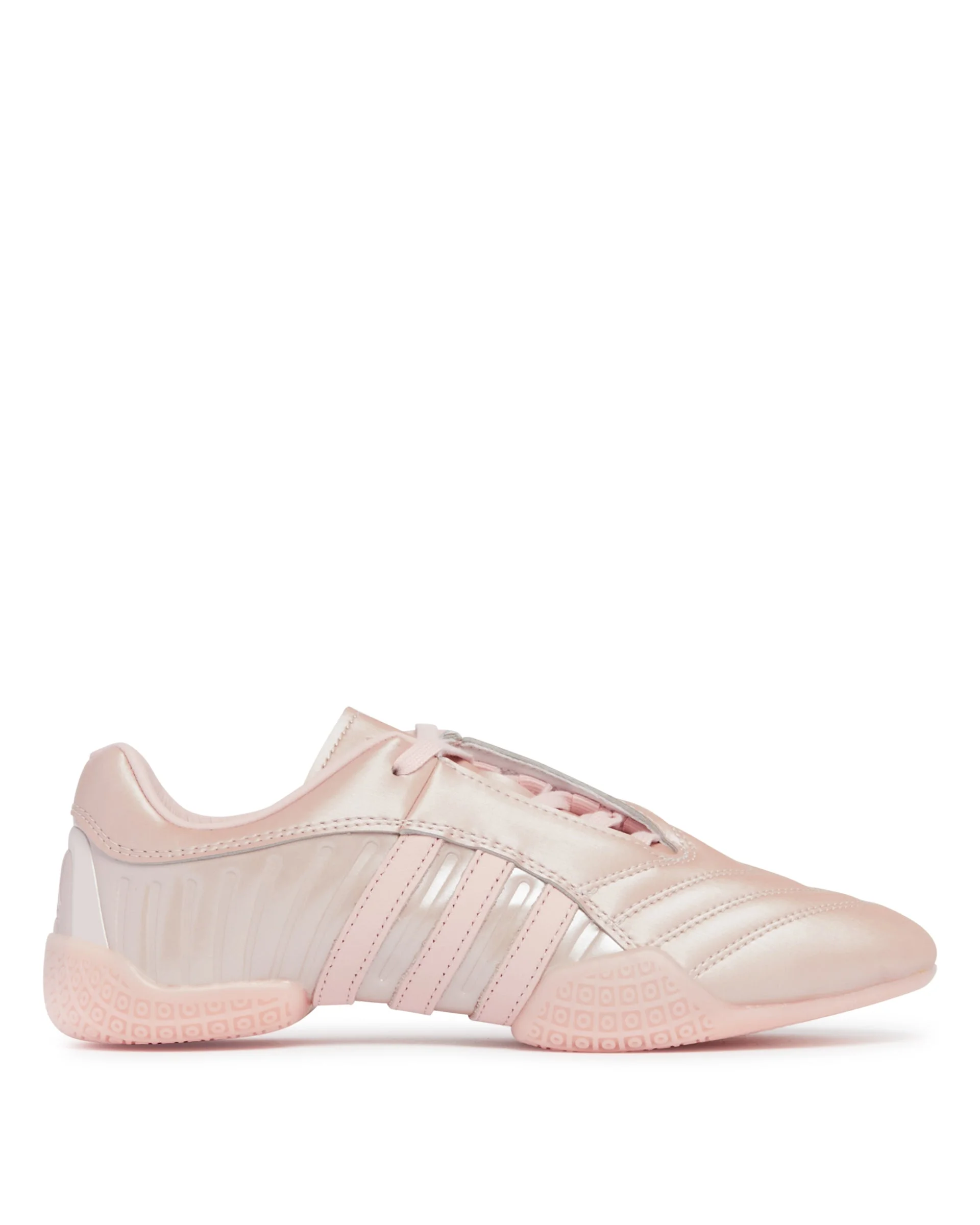 Adidas Originals Pink Taekwondo Mei Elite Sneakers. Pink leather upper, fabric and leather insole, rubber sole. Asymmetric lacing, decorative stitching on the toe and side stripes wrapping around the sole. Regular fit, embroidered logo on the tongue. DETAILS Model: HQ9181ROS Composition: Upper: 50% Rubber, 50% Leather; Sole: 100% Rubber Made in: Vietnam Season: SS26
