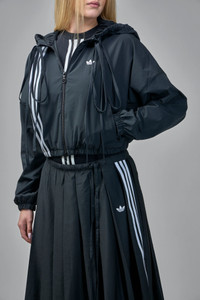 Lightweight cropped hooded jacket featuring vertical contrast stripes and a trefoil logo at the chest. It has a full-length front zipper, adjustable drawstring hood, and elasticated hem and cuffs for a sporty fit. Materials: 100% Polyester Color: black SKU: 153776 Brand style: JX2698 Size and Fit The model is 1.80m (5.9ft) and wears a size S. Designed with a wide, box-like shape, generally not following body contours.