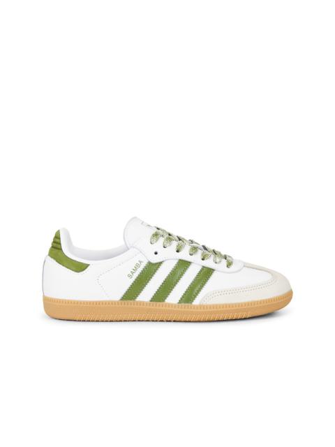 - Leather upper with suede trim and rubber gum sole - Lace-up front - Signature three leather stripes at side panels with embroidered star detailing - Cushioned textile footbed - Printed SAMBA logo at side panel - Printed adidas logo at tongue - Padded low-cut collar - Additional laces included - Revolve Style No. AORI-WZ189 - Manufacturer Style No. JS1352