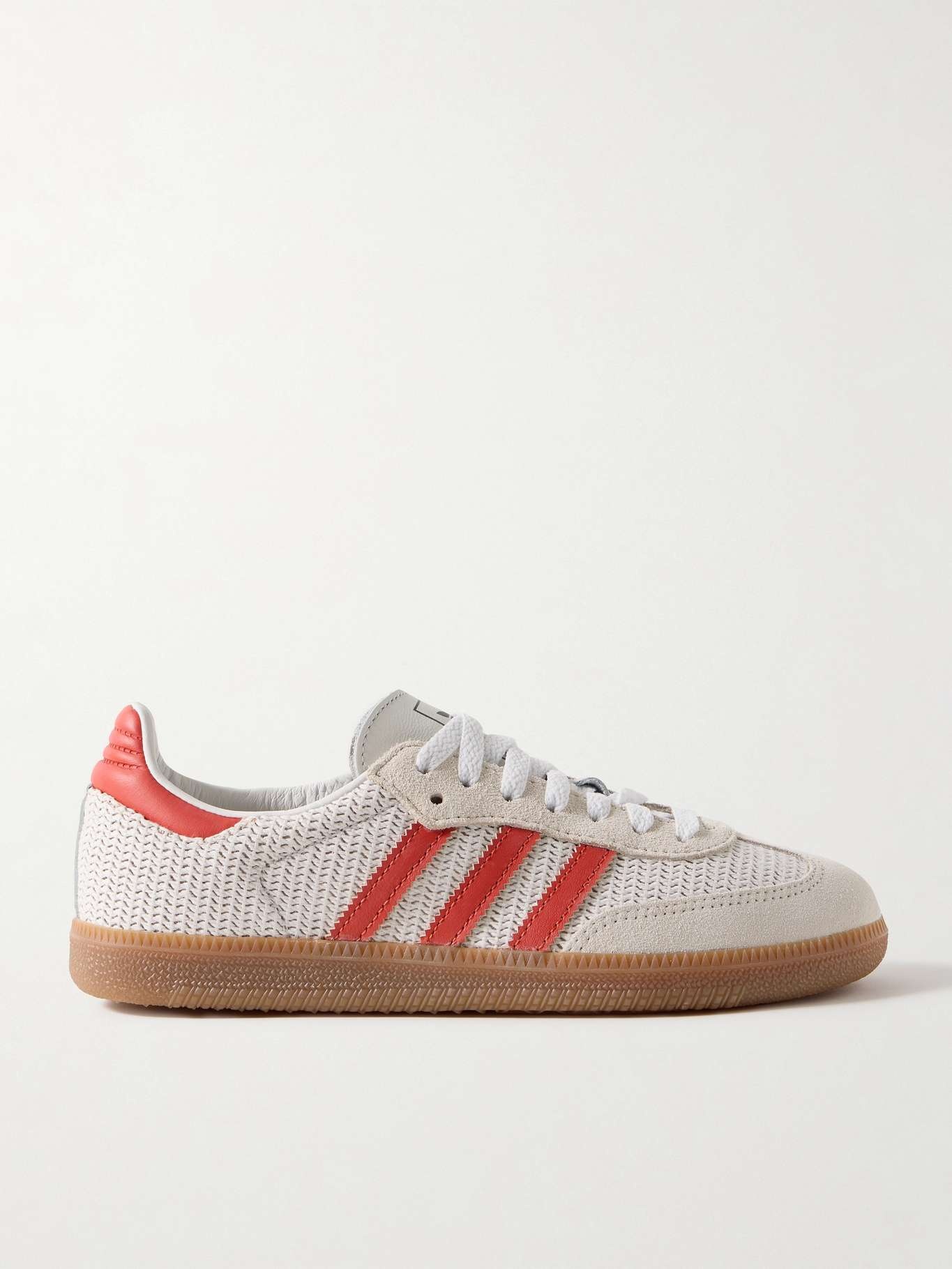 EDITORS'NOTES You'll find yourself turning to adidas Originals' 'Samba OG' sneakers so often - the timeless design will never go out of style. This knitted version has a low-top profile featuring suede toe caps and contrasting leather stripes at the sides. The gum soles and red accents are sure to stand out among other pairs in your collection. SIZE & FIT Fits true to size, please refer to Adidas size guide below: - UK 3.5 = Men’s US 4/ Women’s US 5/ EU 36 - UK 4 = Men’s US 4.5/ Women’s US 5.5/ EU 36.7 - UK 4.5 = Men’s US 5/ Women’s US 6/ EU 37.3 - UK 5 = Men’s US 5.5/ Women’s US 6.5/ EU 38 - UK 5.5 = Men’s US 6/ Women’s US 7/ EU 38.7 - UK 6 = Men’s US 6.5/ Women’s US 7.5/ EU 39.3 - UK 6.5 = Men’s US 7/ Women’s US 8/ EU 40 - UK 7 = Men’s US 7.5/ Women’s US 8.5/ EU 40.7 - UK 7.5 = Men’s US 8/ Women’s US 9/ EU 41.3 - UK 8 = Men’s US 8.5/ Women’s US 9.5/ EU 42 - UK 8.5 = Men’s US 9/ Women’s US 10/ EU 42.7 - UK 9 = Men’s US 9.5/ Women’s US 10.5/ EU 43.3 - UK 9.5 = Men’s US 10/ Women’s US 11/ EU 44 - UK 10 = Men’s US 10.5/ Women’s US 11.5/ EU 44.7 - UK 10.5 = Men’s US 11/ Women’s US 12/ EU 45.3 - UK 11 = Men’s US 11.5/ Women’s US 12.5/ EU 46 - UK 11.5 = Men’s US 12/ Women’s US 13/ EU 46.7 - UK 12 = Men’s US 12.5/ Women’s US 13.5/ EU 47.3 DETAILS & CARE - Rubber sole measures approximately 20mm/ 1 inch - White knit, off-white suede, red leather (Cow) - Lace-up front - adidas Originals follows its own size guide, therefore the size stated on the box will differ from the one provided in our size chart. To receive your correct fit, please refer to Size & Fit notes