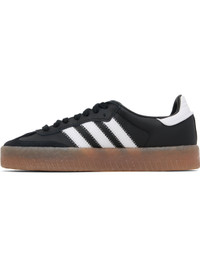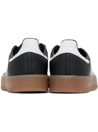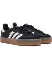 Low-top buffed leather and nubuck sneakers. · Lace-up closure · Logo printed at tongue · Padded collar · Text stamp at outer side · Signature serrated stripes at sides · Quilted heel tab · Mesh lining · Treaded gum rubber sole Supplier color: Core black/Cloud white/Gold metallic Upper: leather. Sole: rubber. Made in Indonesia 252751F128150