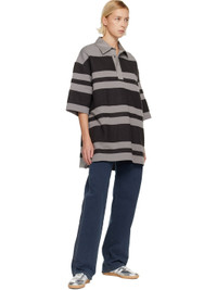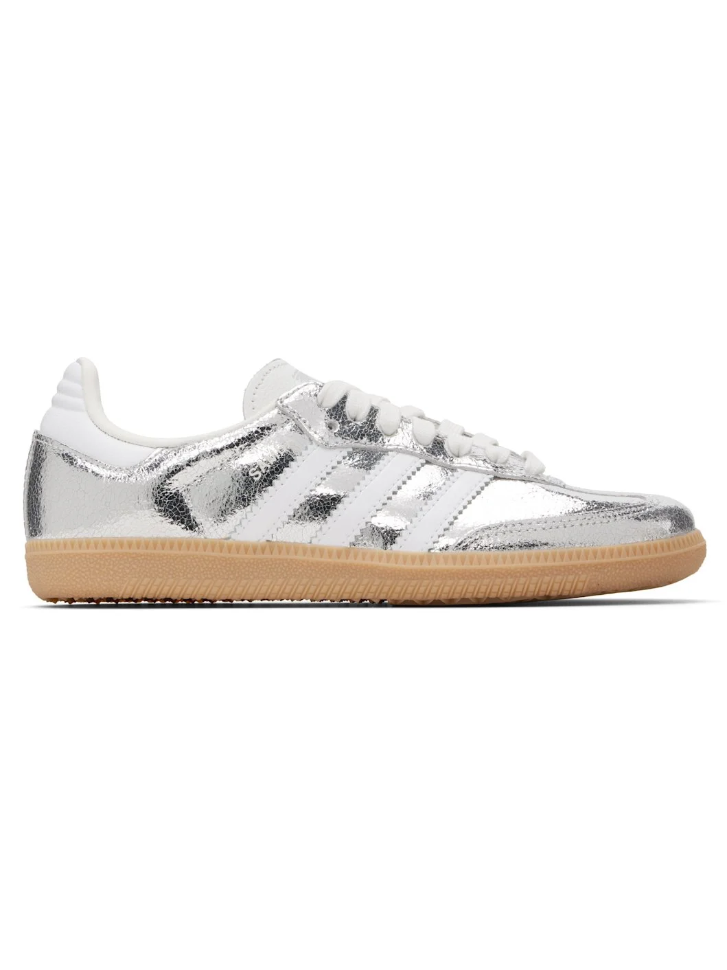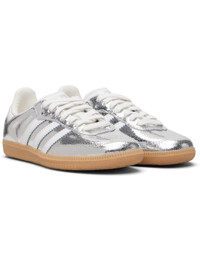 Low-top crinkled leather sneakers. · Lace-up closure · Logo stamp at tongue · Padded collar · Signature serrated stripes at sides · Text stamp at outer side · Quilting at heel tab · Faux-leather lining · Treaded rubber sole Supplier color: Silver Metallic/Cloud White/Core White Upper: leather, synthetic. Sole: rubber. Made in India 261751F128052