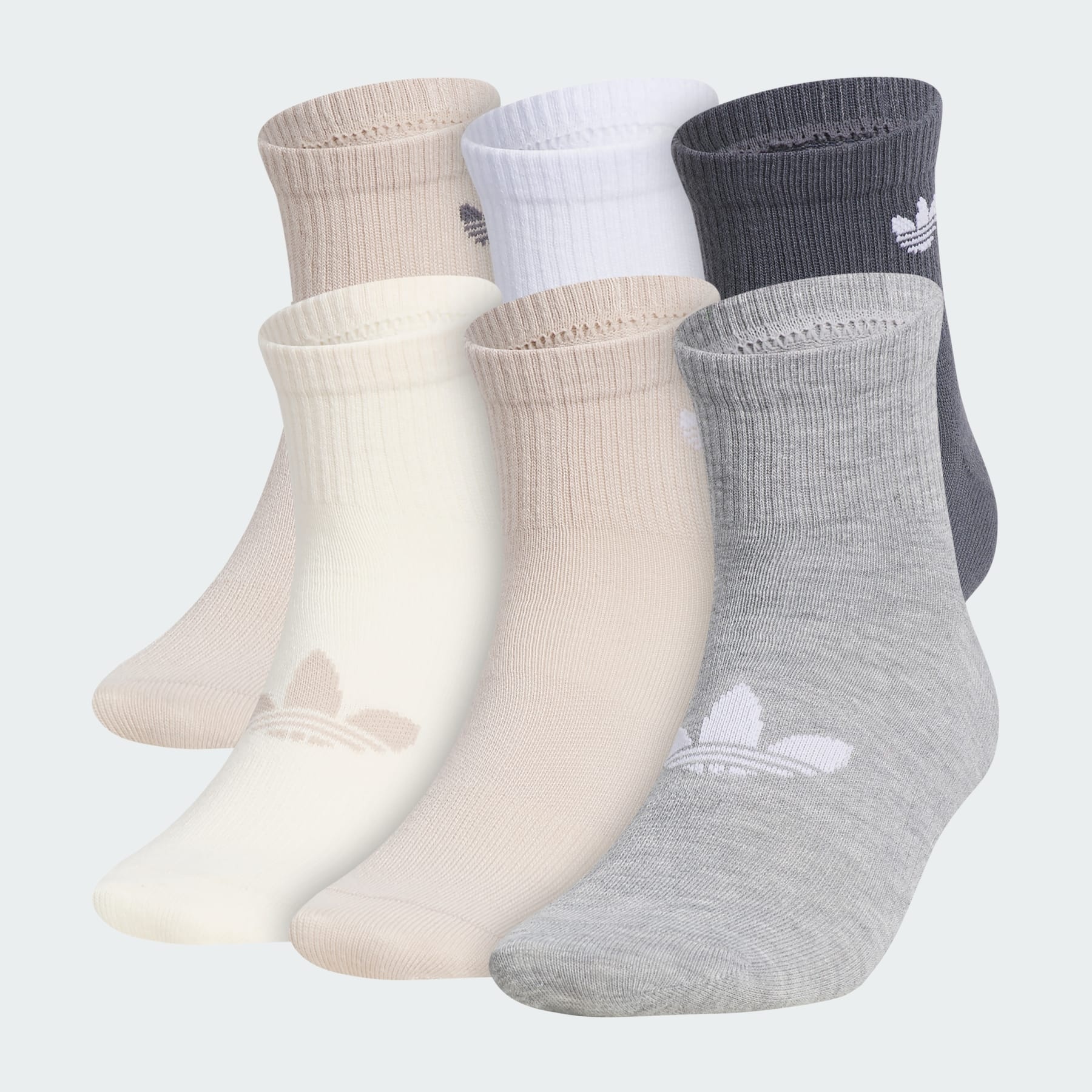 A six pack of super-light crew socks with sweat-wicking yarns. Keep your feet comfortable in these adidas Originals quarter socks. They have a stretchy fit and a super-lightweight feel, with moisture-wicking yarns to keep sweat in check. Six pairs to a pack get you through the week. Details - 94% polyester, 6% elastane - Arch compression - Moisture-wicking - Reinforced toes - Lightweight feel - Imported - Product code: JJ9775 - Product color: Beige / Onix / Wonder White