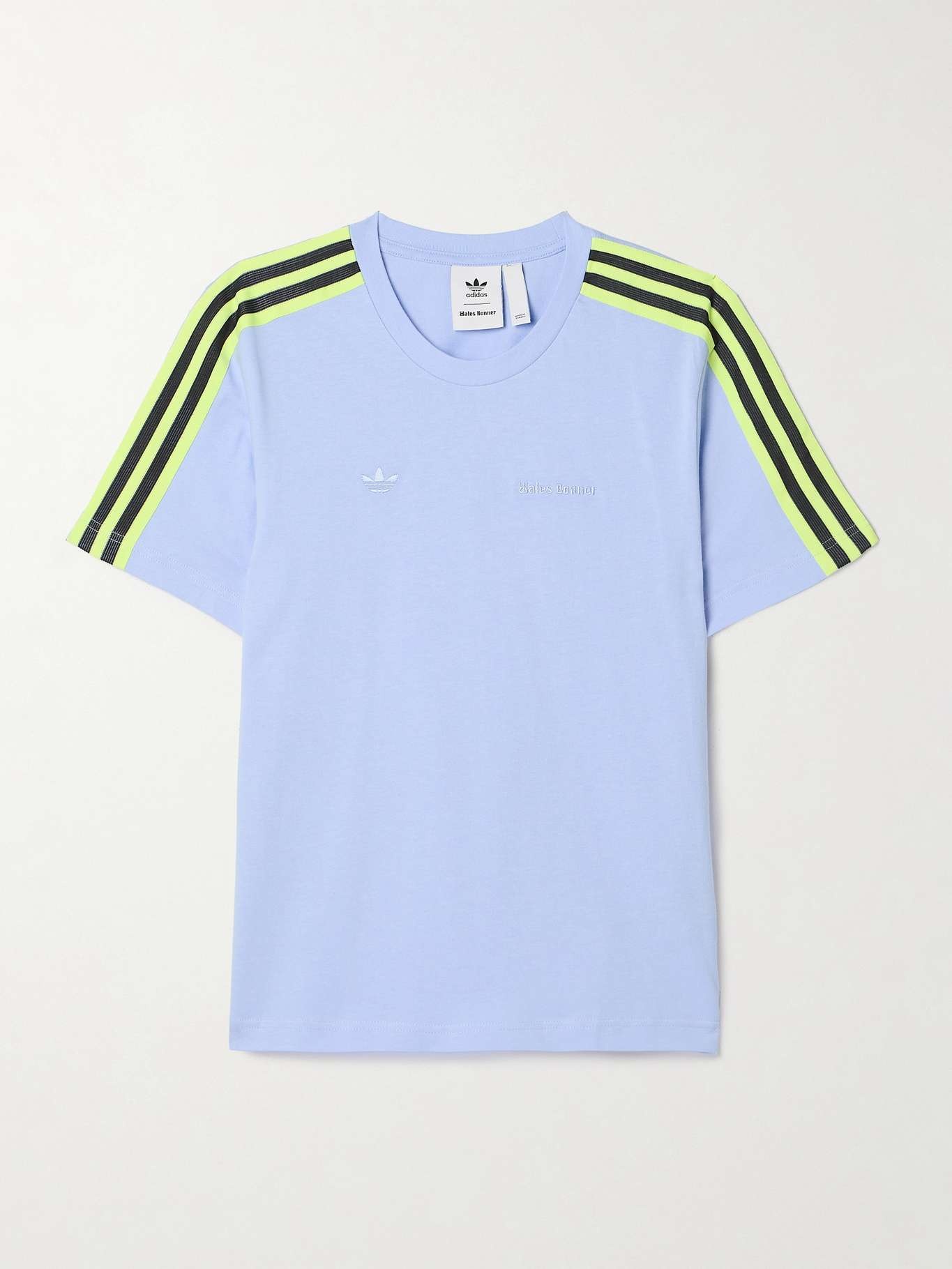 EDITORS'NOTES adidas Originals has been collaborating with Wales Bonner since Fall '20, and each new collection is just as popular as the last. This T-shirt is cut from organic cotton-jersey and embroidered with both monikers at the chest. Chartreuse and black webbing trims depict the sportswear brand's signature stripes. SIZE & FIT Model measurements: - Fits true to size, take your normal size - Intended for a slightly loose fit - Mid-weight, slightly stretchy fabric - Model is 183cm/ 6'0" and is wearing a size Small - Bust: 76.2cm/ 30" - Waist: 61cm/ 24" - Hip: 88.9cm/ 35" DETAILS & CARE - Light-blue organic cotton-jersey, chartreuse and black webbing - Slips on - 100% organic cotton - Machine wash