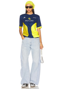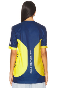 - 100% polyester - Machine wash - Pull-on styling - Front and back printed slogan - Signature three stripes at sleeves - Ribbed trim - Lightweight jersey fabric - Revolve Style No. AORI-WS11 - Manufacturer Style No. JK9606