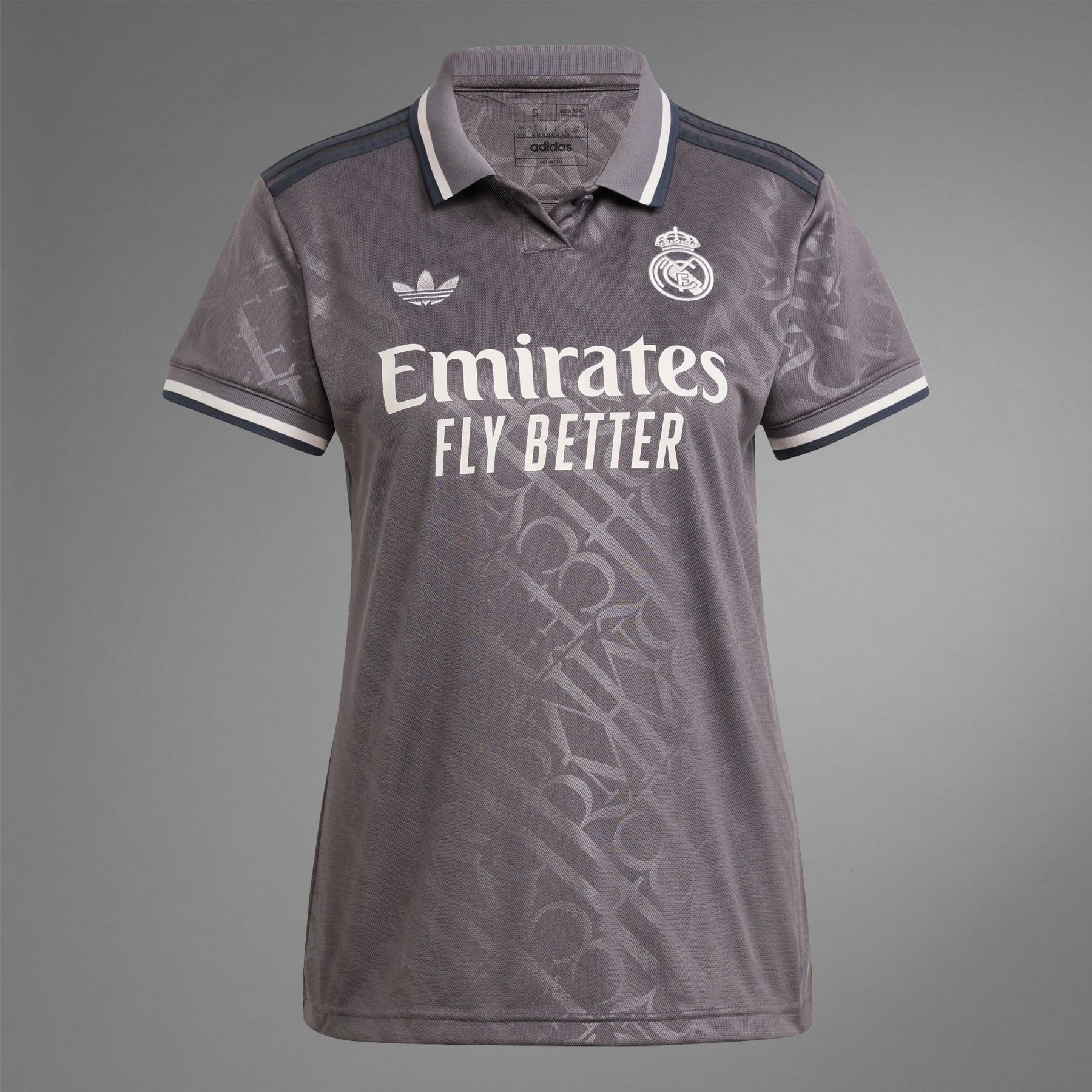 A fashion-forward Los Blancos jersey for supporters, made with recycled materials. Elegance is their identity. The embossed "RMCF" monograms repeating across this Real Madrid third jersey borrow their distinctive look from the lettering used on traditional Madrid street signs. Standing out from the classy design, the iconic Trefoil returns to an adidas match shirt after a long break. Behind it all, AEROREADY keeps soccer fans dry and comfortable as they shout their support. This product is made with 100% recycled materials. By reusing materials that have already been created, we help to reduce waste and our reliance on finite resources and reduce the footprint of the products we make. Details - Regular fit - One-button polo collar - 100% recycled polyester tricot - AEROREADY - Side mesh inserts - Real Madrid embroidered crest - Imported - Product code: IT3439 - Product color: Charcoal