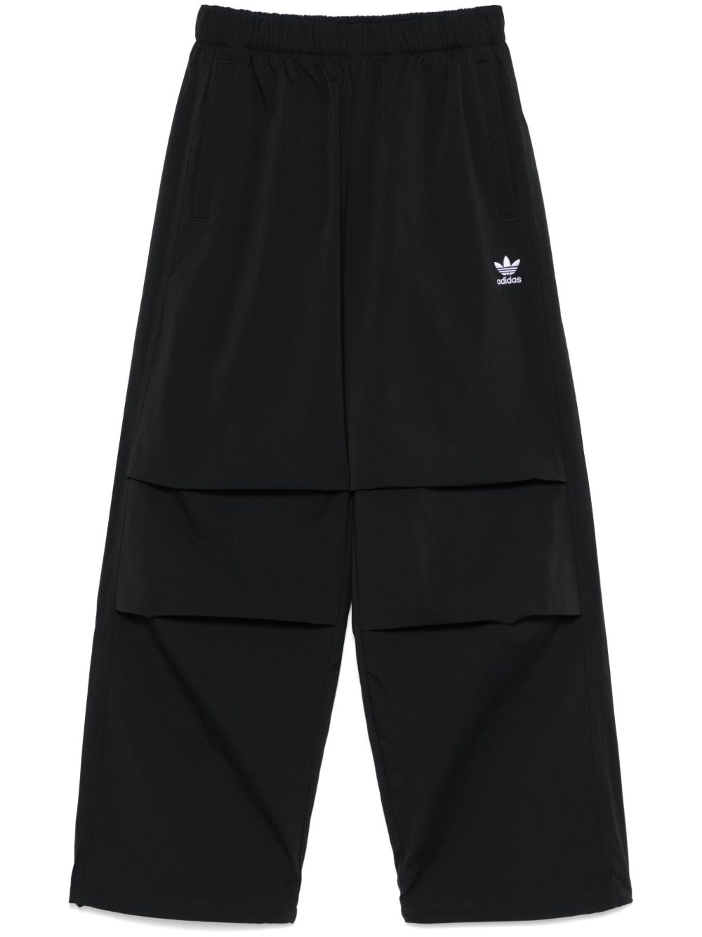 ripstop trousers Highlights - Black - Elasticated waistband with internal drawstring - Two side welt pockets - Pleat detailing - Signature trefoil logo detail Imported Composition Polyamide 94%, Spandex/Elastane 6% SIZE & FIT Model measurements Height 5 ft 10 in(1.77 m) Bust/Chest 32.28 in(82 cm) Hips 35.03 in(89 cm) Waist 25.19 in(64 cm) FittingInformation Designed with a wide-leg cut, these trousers allow for a close fit at the waist and offer a loose and roomy fit over the leg The elasticated waist allows for a comfortable fit Made from a midweight stretch fabric, this piece offers elasticity and flexibility when worn