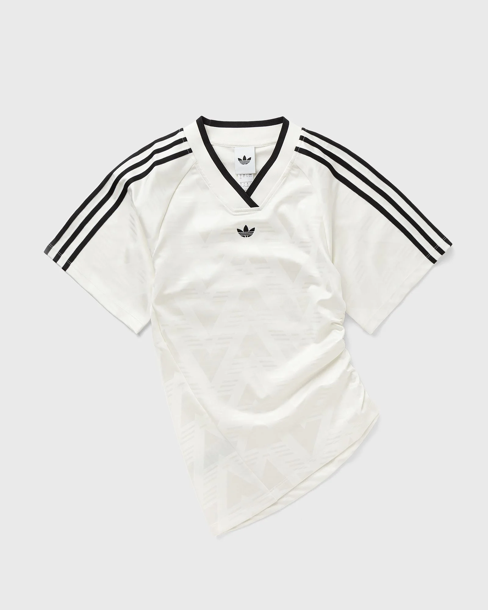 The Rouched Football Jersey by adidas Originals embraces terrace culture and 90s minimalism, translating iconic football details into a modern fashion statement. Jacquard knit adds texture and depth, while the slim fit, V-neck, and distinctive ruffle construction create an expressive silhouette. Featuring the Trefoil logo, the jersey combines authentic soccer heritage with contemporary style. - Slim fit - Jacquard knit - V-neck Article number: KC9122 Gender: women Color: OWHITE Material: 97% Polyester, 3% Spandex/elastane