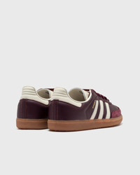 The Samba by adidas has long since ceased to be just what it originally was: a football shoe. The original model was designed in the late 1940s by adidas founder Adi Dassler. These were specifically designed to provide footballers with more grip when they had to play on the ice-covered field. In the meantime, the Samba has become an integral part of the streetwear scene. Characteristic of this sneaker icon are the striking basic design, the T-shaped toe area, the classic rubber outsole in retro design, the typical 3-stripes and, of course, the lettering on the side mostly in an eye-catching metallic look. Article number: ID0477 Gender: men,women Color: MAROON/CREWHT/GOLDMT Material: 30% Rubber, 70% Leather